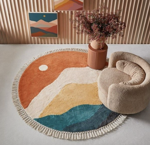 Tạo Điểm Nhấn Độc Đáo: Nếu bạn muốn không gian của mình nổi bật và khác biệt, thảm hình tròn là một lựa chọn lý tưởng. Với thiết kế không góc cạnh, thảm tròn mang lại cảm giác mềm mại, uyển chuyển và tạo điểm nhấn thu hút trong phòng khách hoặc phòng ngủ.